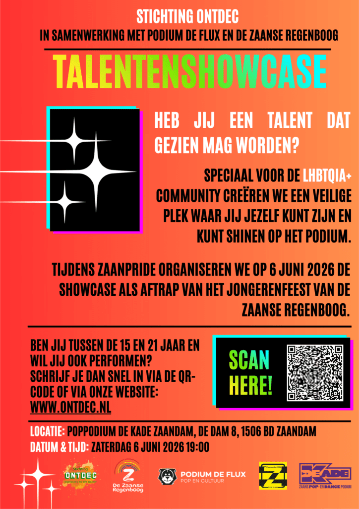 De showcase vindt plaats op 6 juni om 19:00 uur bij Poppodium De Kade in Zaandam, tijdens ZaanPride. Het evenement loopt over in het jongerenfeest van de Zaanse Regenboog, waar je na je optreden kunt blijven om samen verder te vieren.